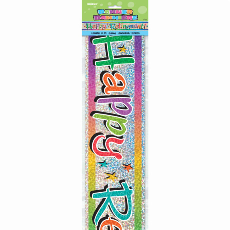 12ft Happy Retirement Prism Banner. Cheers to your retirement! Celebrate this special event with our Prismatic Foil “Happy Retirement!” Banner. 1 Banner – 12 ft. This prismatic foil banner features a colorful “Happy Retirement!” headline with star prints on a holographic background. Perfect as a photography backdrop on your retirement party, adding a fun and beautiful decoration to your party. Made of durable material that is easy to assemble and hang up. This banner can be reused and easily stored to use in the future.