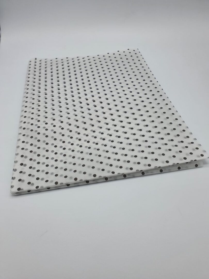 DESCRIPTION: White 17/19gsm acid free tissue paper with Black spotty design.