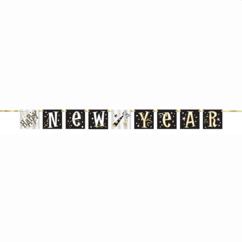 Happy New Year Block Banner. Happy New Year Banner measures approximately 5ft (1.5m) in length. Party banner features streamers, a party horn and confetti decorations combined with stylish silver and gold “Happy New Year!” text. Simply hang this banner from the walls, across a large window, or along party tables at your New Years Eve party. Coordinate with other New Year party supplies and New Years Eve decorations from our range.
