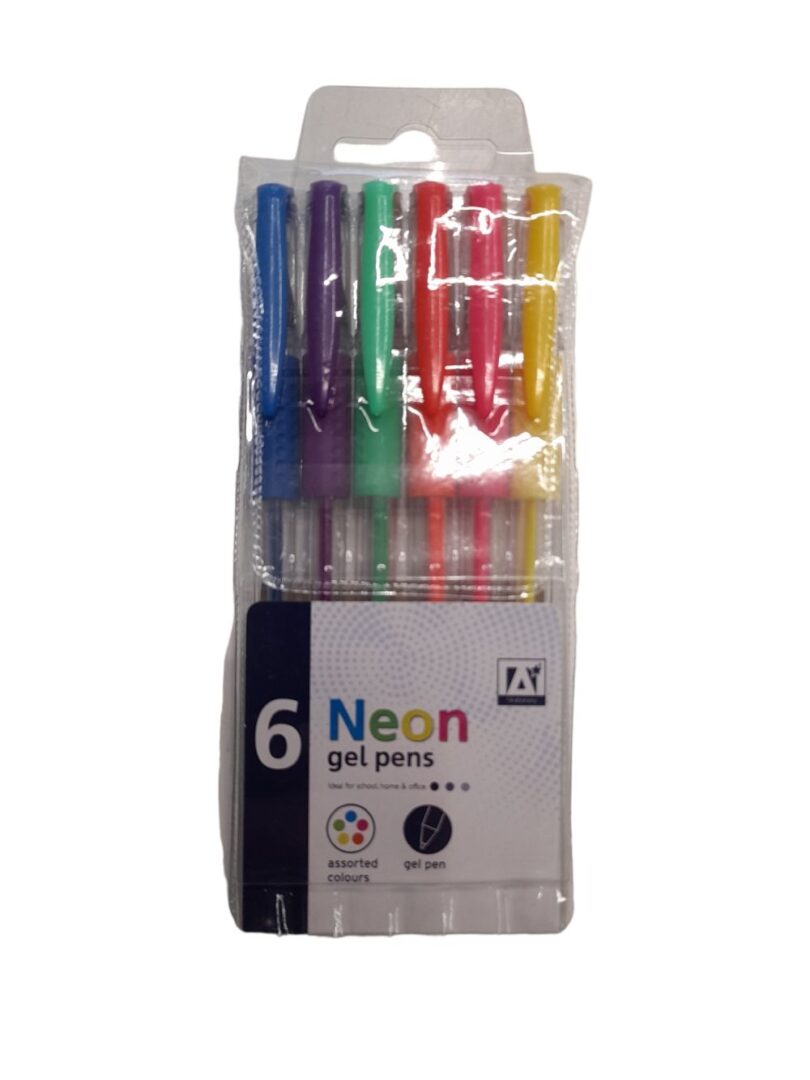 Pack of 6 Neon Gel Pens. Assorted colour: Blue, Purple, Green, Orange, Pink, Yellow. The pens are complete with matching lids and feature a handy clip attachment. Ideal for home, school and office.