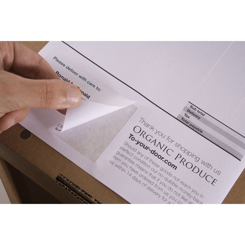 Single Integrated Label Style A contains one removable self-adhesive area. It is ideal for printing a packing note or invoice and dispatch label in one pass.