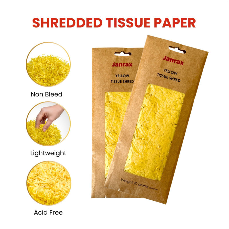 Yellow Tissue Shred 20g. Add texture, colours, and style to your gift wrapping, crafts, and decorations with this Tissue Shred. Made from soft, high-quality tissue paper, this shredded filler is perfect for enhancing gift baskets, gift bags, floral arrangements, and more. Available in a variety of colours, Tissue Shred provides the ideal finishing touch for any occasion, from birthdays to weddings, or just to make your gifts stand out.